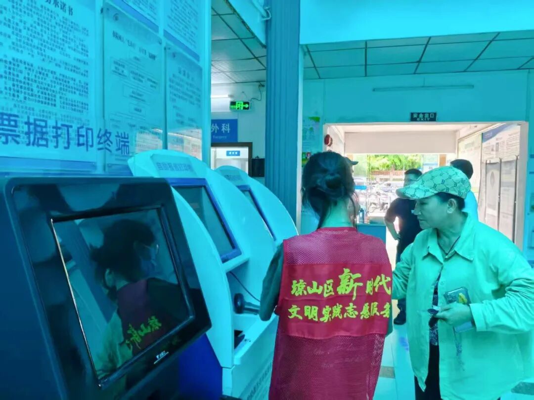 两院区门诊大厅里,志愿者们忙碌的身影随处可见。协助挂号、缴费,引导患者就诊,面对患者对医院布局和流程的困惑,他们耐心解答,助患者快速找到目的地。活动期间,日均引导患者超60人次,有效缓解门诊人流拥堵,让就诊秩序井然有序。随着医院信息化推进,自助设备增多,部分老年患者操作不熟,志愿者主动上前,耐心指导使用自助检验报告打印机等设备,帮患者节省排队时间,提高就诊效率,让患者感受科技便利。