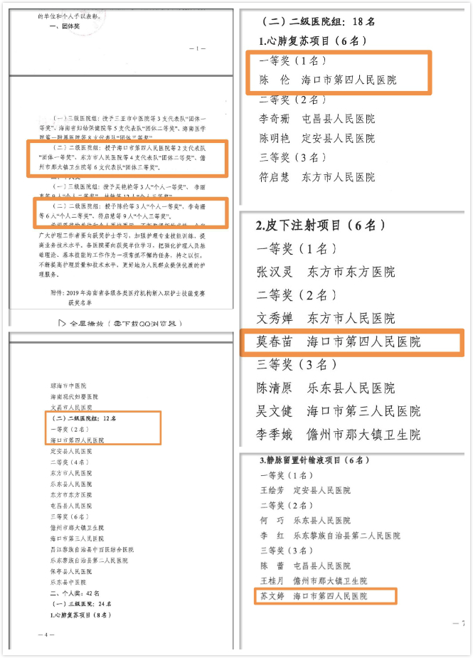 本次竞赛分为理论笔试和综合比武两部分,而综合比武又分为静脉留置针输液法、单人徒手心肺复苏术和皮下注射法。参赛选手通过电脑随机抽取,每家医疗机构随机产生三名参赛选手。经过二级以上医疗机构及部分卫生院等46家医疗机构抽取的138名参赛选手的激烈紧张的角逐,我院被抽取参赛的3名选手团结协作,顽强拼搏,在竞赛中分别荣获佳绩,以总分第一荣获二级医院组一等奖,陈伦荣获二级医院组个人一等奖,莫春苗荣获二级医院组个人二等奖,苏文婷荣获二级医院组个人三等奖。