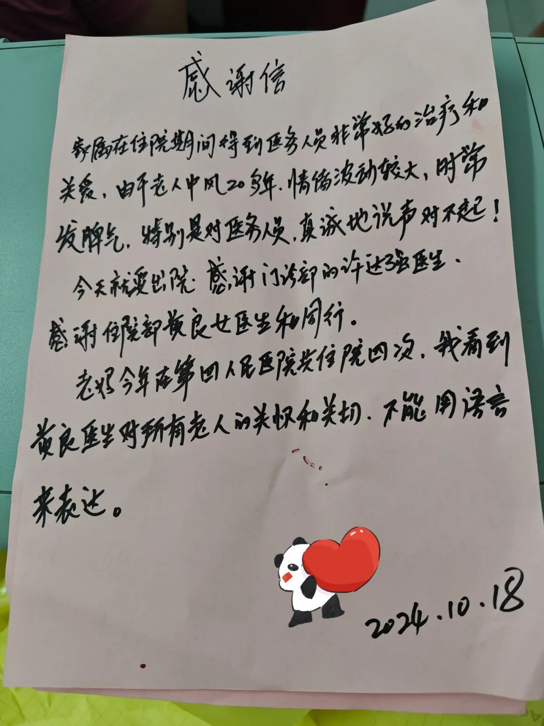 经过11天的精心治疗,谢奶奶的症状得到了显著改善,并于近日顺利出院。谢奶奶的儿子在感谢信中深情地写道:“在海口市第四人民医院,我们感受到了医护人员的专业与敬业,更感受到了他们对患者的关爱与温暖。是你们的付出,让我母亲重新找回了健康与笑容。在此,我们全家人向你们表示最诚挚的感谢!”