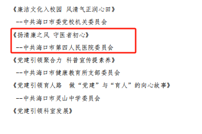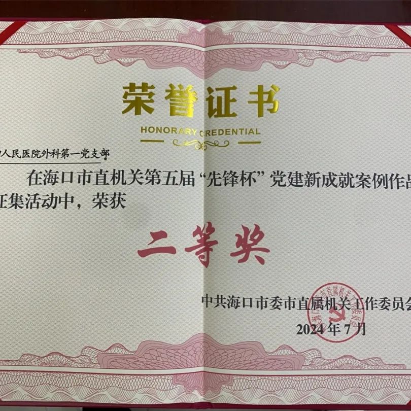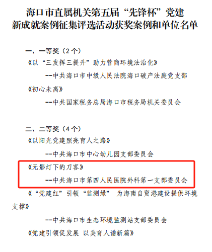 在“实干谱华章 共筑自贸港”为主题的海口市直属机关第五届“先锋杯”党建新成就案例作品征集评选活动中,经过线下初评和专家评审,我院外科第一党支部参评作品《无影灯下的刀客》荣获二等奖,这一殊荣凝聚了手术室医护团队数日来的辛勤汗水与智慧结晶与院办团队的紧密配合;院党委参评作品《扬清廉之风 守医者初心》荣获优秀奖。
