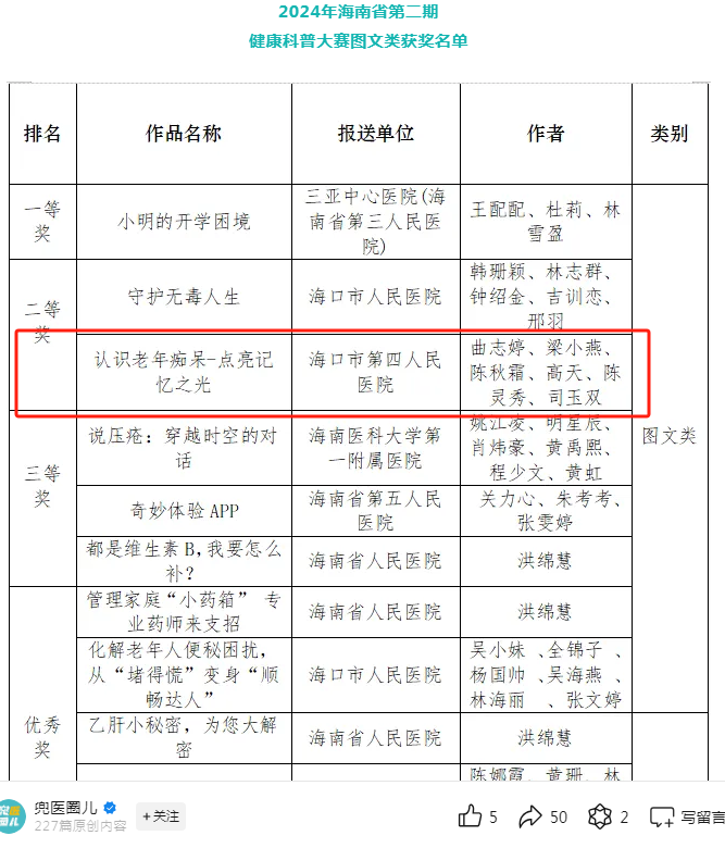 由海南省卫生健康委员会、海南省科学技术协会主办,海南省健康宣传教育中心承办的海南省2024年度第二期“白大褂说科普”健康科普大赛活动,经过前期申报、初选审核、公众投票、专家评审等环节,最终产生视频类一等奖1名、二等奖2名、三等奖3名,优秀奖5名;图文漫画类一等奖1名、二等奖2名、三等奖3名,优秀奖5名。