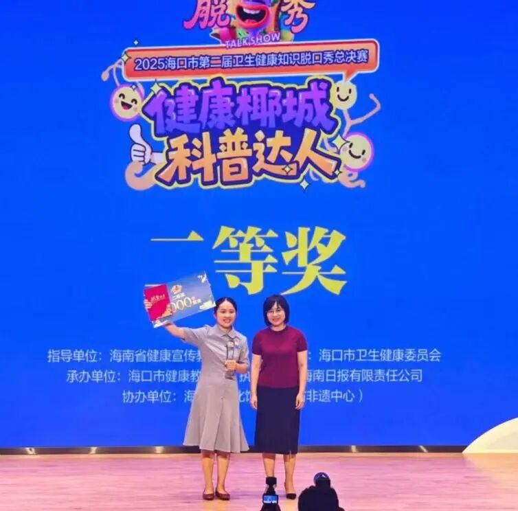 9月27日上午,2025海口市第二届卫生健康知识脱口秀大赛总决赛暨颁奖仪式在海南省文化馆(海南省非遗中心)学术报告厅举办。经过激烈比拼,我院选手邓瑜凭借出色表现,荣获大赛二等奖!